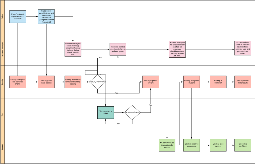 I created a user workflow map (swimlane) that distinctly showed inefficiencies in the current process and revealed process gaps to be closed.